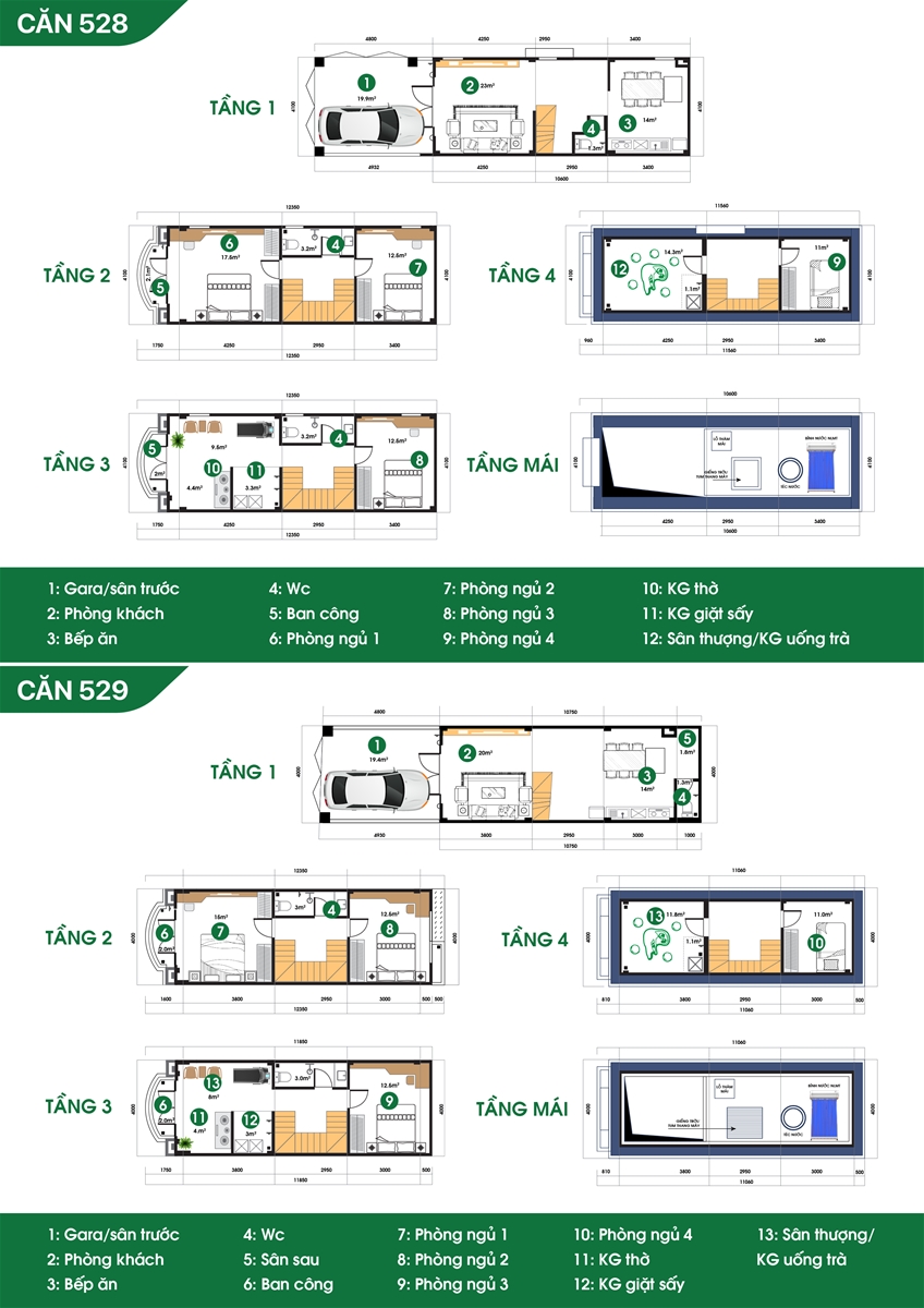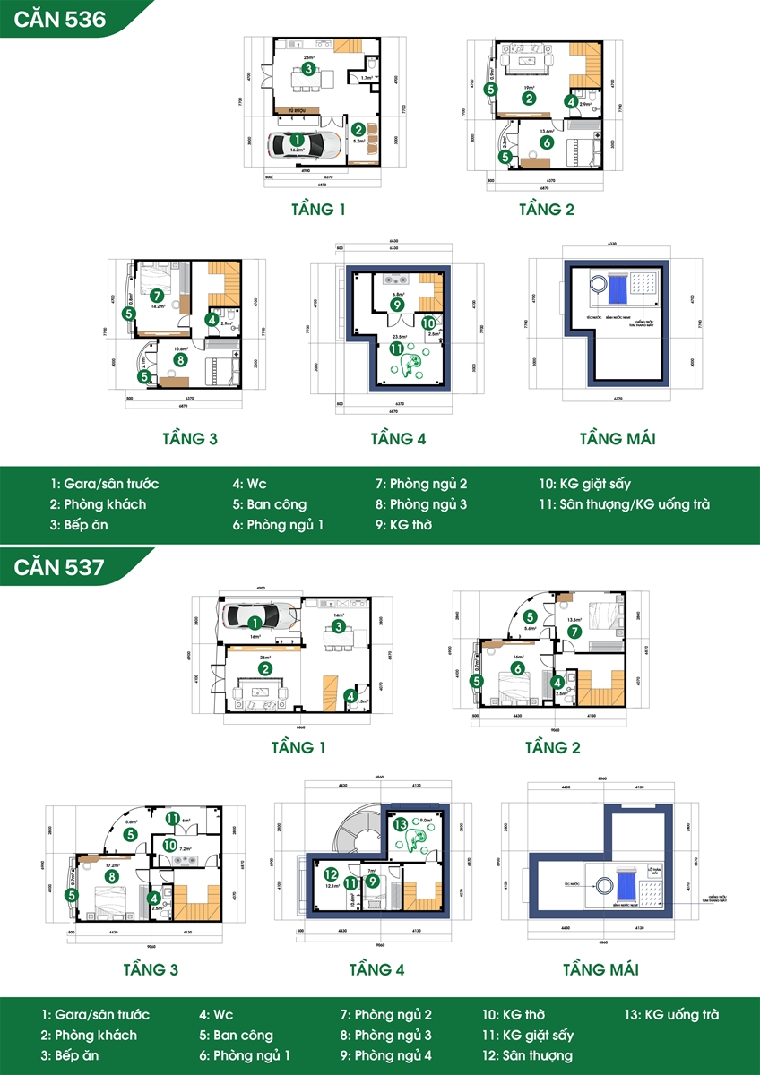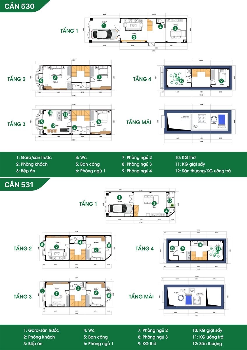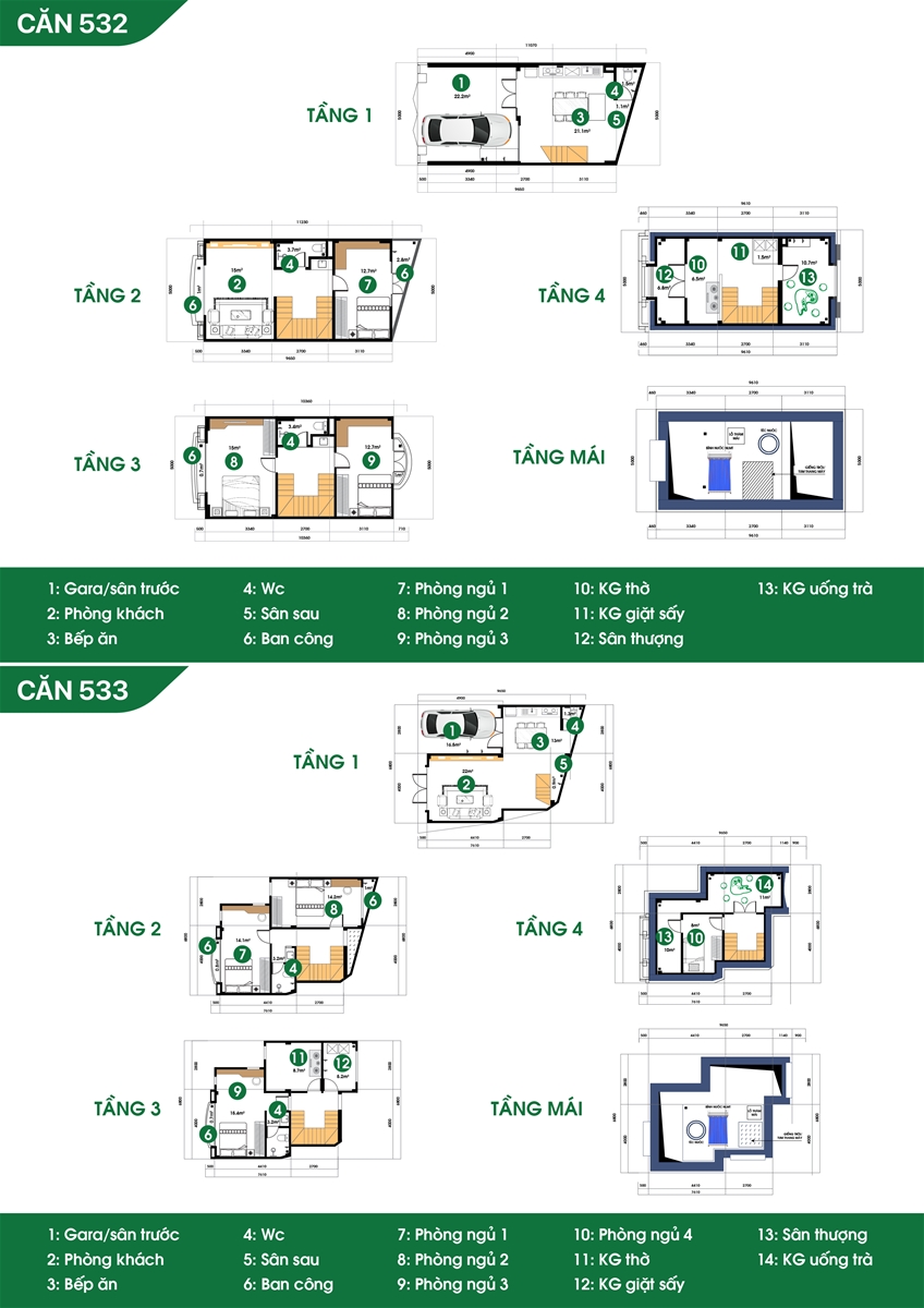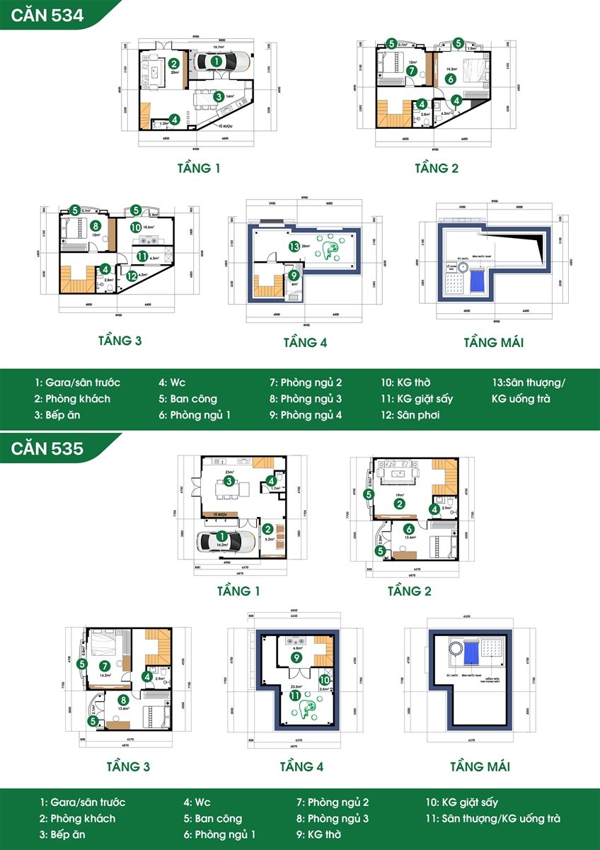 Công năng: Gara ô tô/ sân trước, phòng khách, bếp, 3-4 phòng ngủ, WC, ban công, phòng thờ, khu giặt phơi, tum chờ thang máy thủy lực, sân thượng.