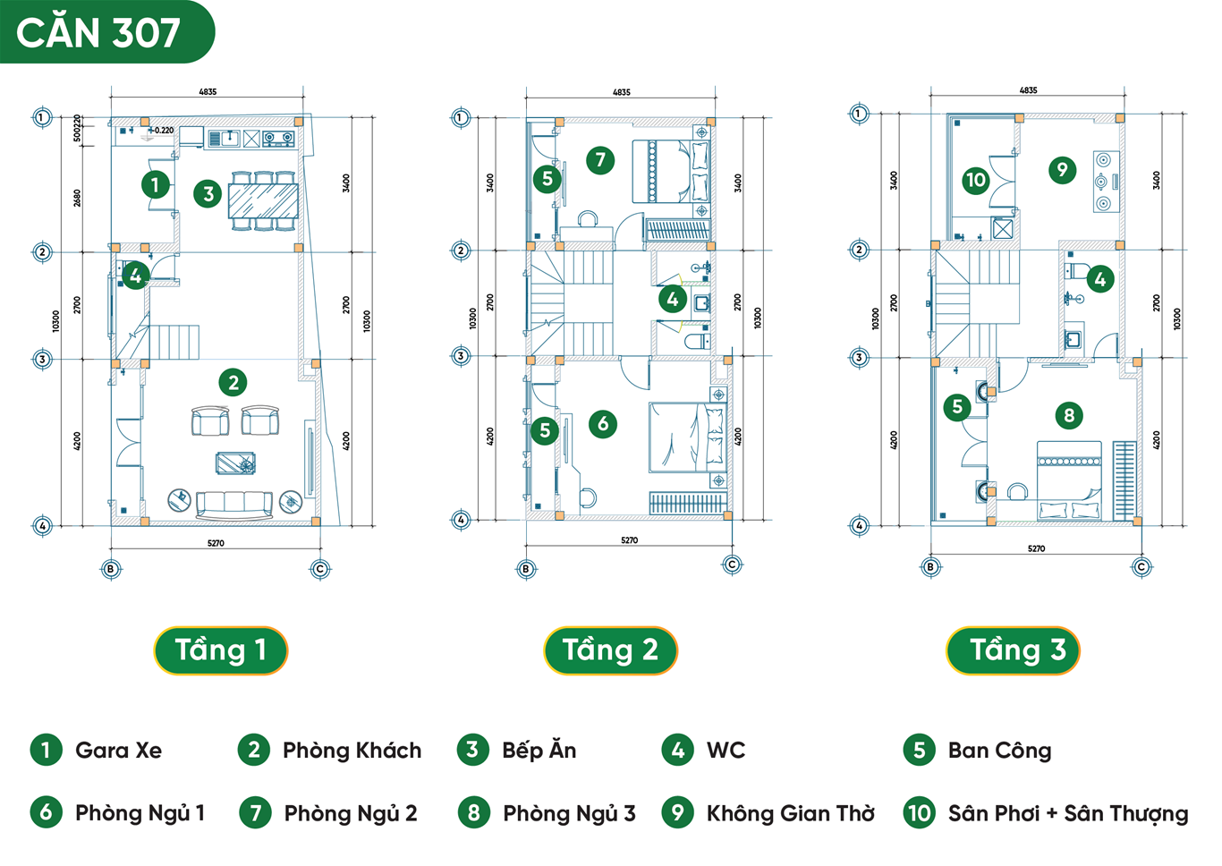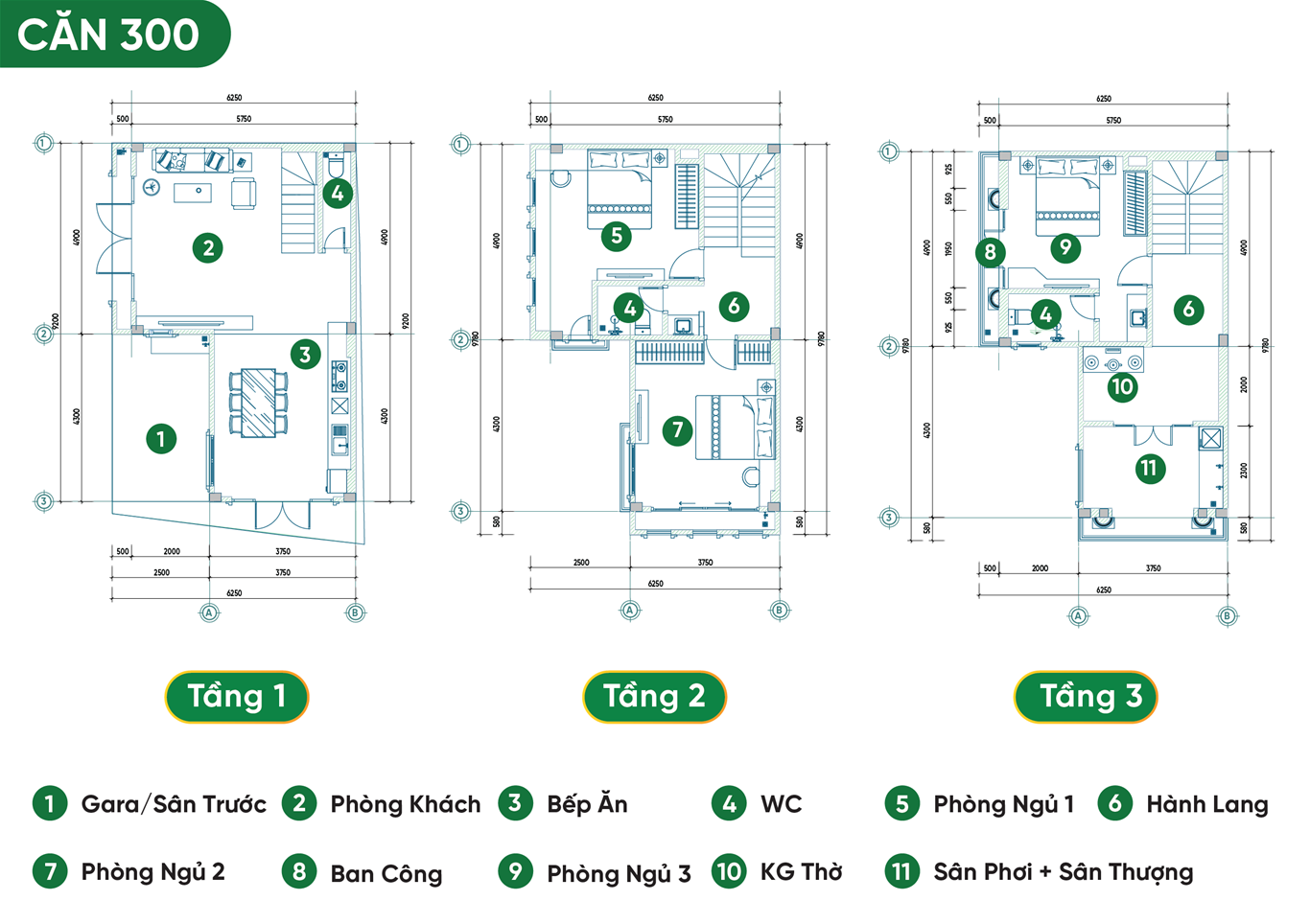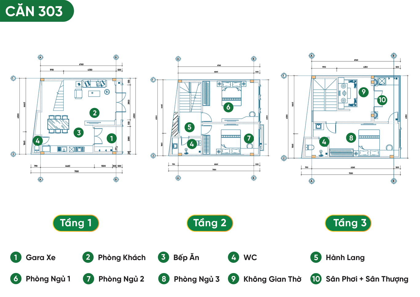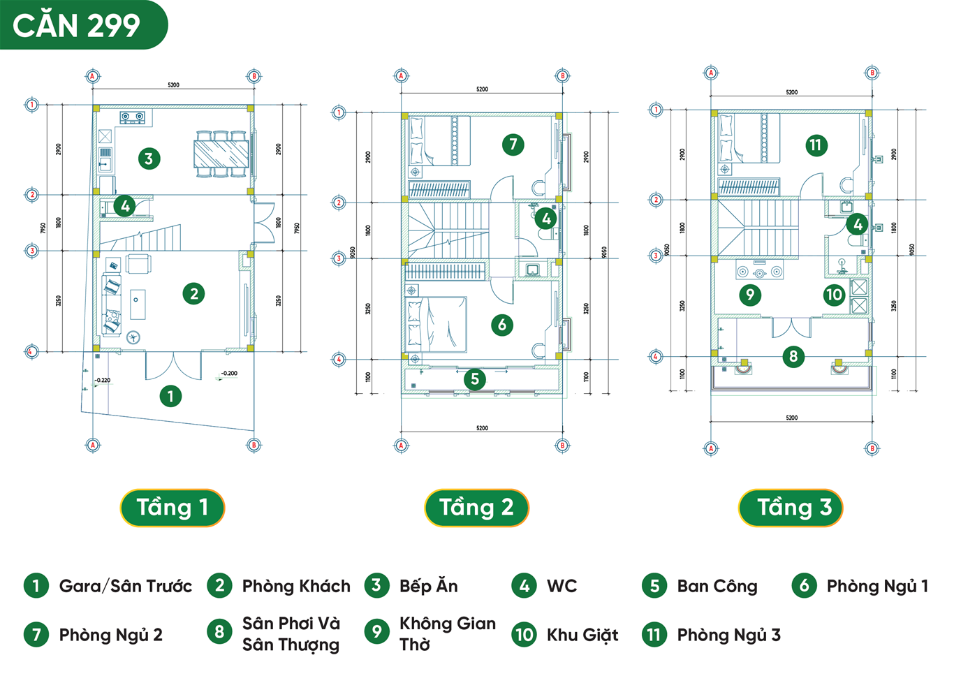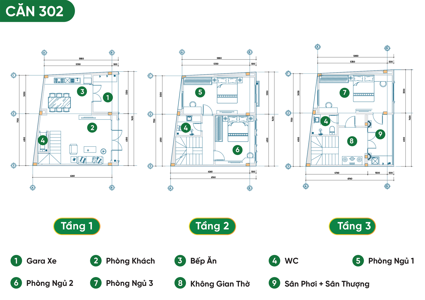Công năng: Phòng khách, bếp ăn, 3 phòng ngủ, 3 WC, phòng thờ, sân KHÔNG GIAN PHÒNG NGỦ KHÔNG GIAN KHÁC phơi / ban công, giếng trời, gara xe