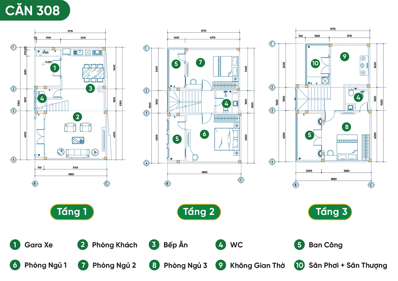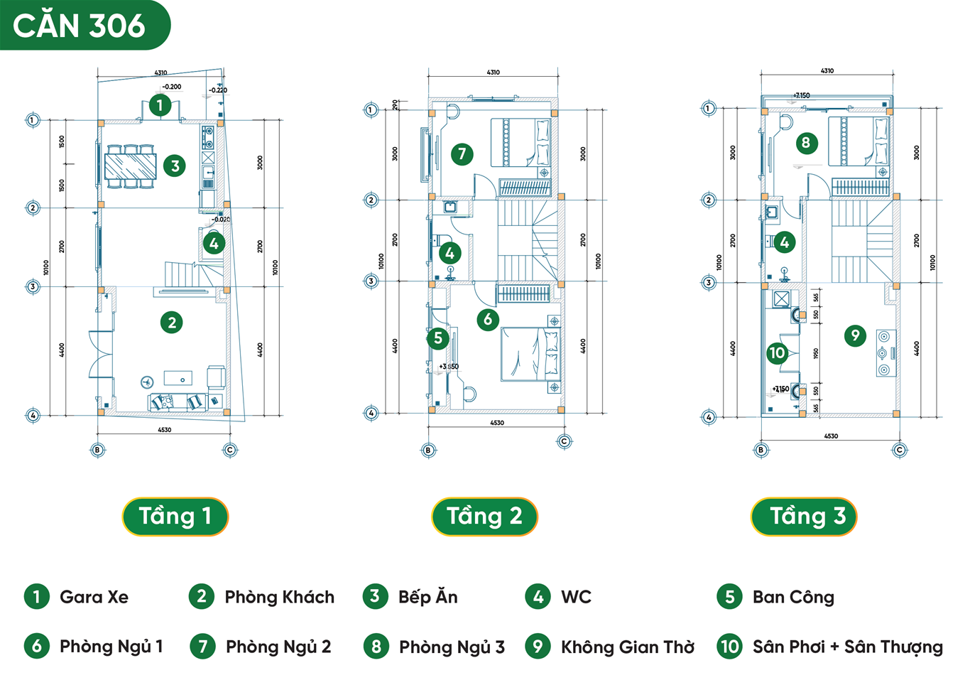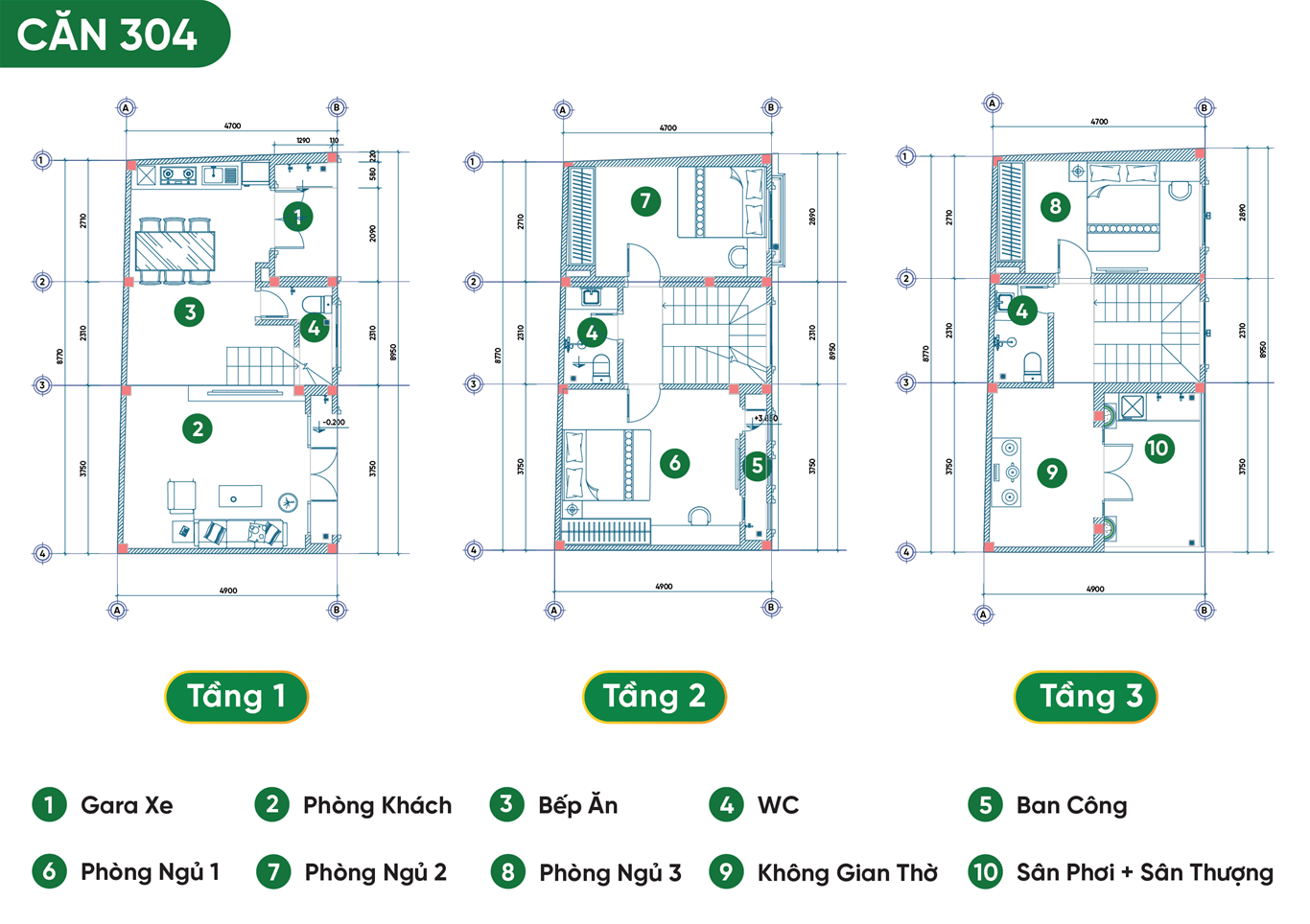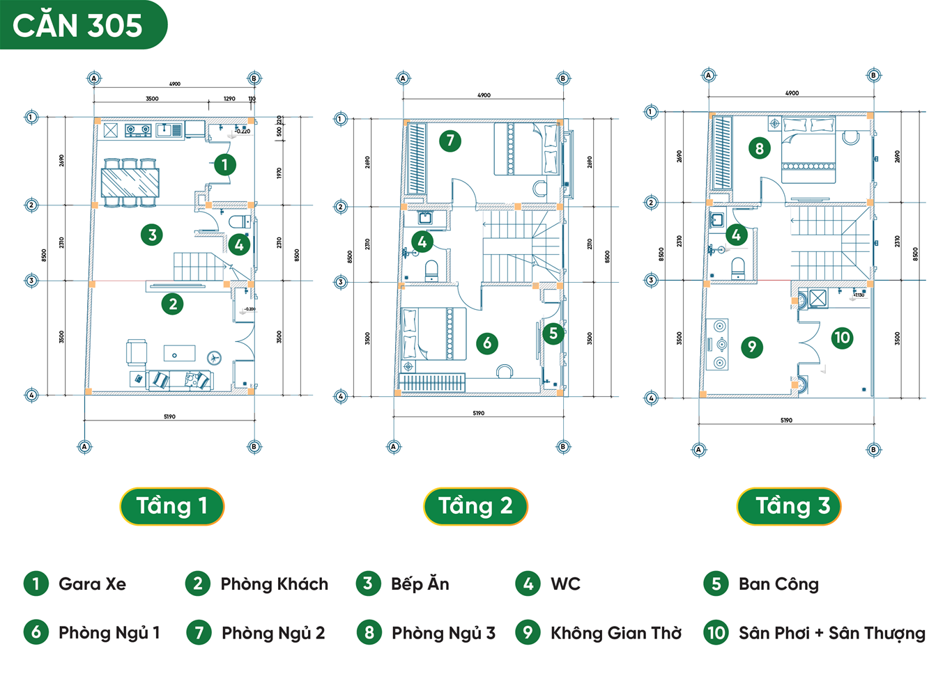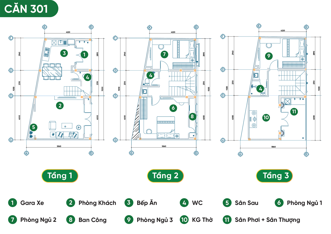 Công năng: Phòng khách, bếp ăn, 3 phòng ngủ, 3 WC, phòng thờ, sân KHÔNG GIAN PHÒNG NGỦ KHÔNG GIAN KHÁC phơi / ban công, giếng trời, gara xe
